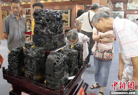 6月10日,7000多種廣東潮州特色的“潮貨”齊聚武漢國際會(huì)展中心,其中一套市場價(jià)約2.99億元的黑翠玉印章,引來眾多市民看稀奇,成為最搶眼的明星。據(jù)工作人員介紹,這套龍型印章是用一種潮州特產(chǎn)的黑翠玉為原料、鏤空雕刻而成,一套9個(gè),總重約150公斤。