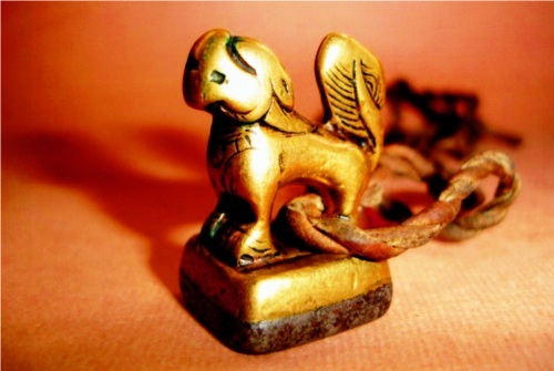藏族古印章的印綬大多采用皮、毛、絲等材料,如鹿皮、牛皮、豹皮等動(dòng)物的皮,或羊毛、牛毛,絳色、黃色、紫色、紅色等彩色絲帶也常見。