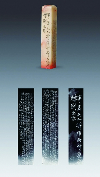 此方章為1935年日本東京傅抱石書畫篆刻作品展的原件。原印面為“一生都只為花忙”,后來傅抱石將印面磨去,改刻“劉芳”二字,贈予羅寄梅的夫人劉芳。在這方高4厘米,邊寬僅為7毫米的印章上,傅抱石用神鬼之筆刊刻了二百多字的“百花詩”,堪稱絕妙。傅抱石細(xì)字長跋的篆刻作品歷來極受學(xué)界贊譽(yù),被認(rèn)為幾乎不可能用肉眼刊刻。1935年傅抱石在日本舉辦書畫篆刻作品展時,被日本學(xué)術(shù)界稱作“精神雕刻”,橫山大觀贊譽(yù)他“中國的雕刻大師壓倒了日本的‘粒米能手’”。據(jù)傅抱石自己說,刻這方印章時是不用肉眼看的,完全憑感覺一氣呵成。從年款來看,百花詩就刻于乙亥年(1935)。有關(guān)資料記載,在傅抱石的篆刻生涯中,微刻邊款的印章一共有九件,如今一件藏于江西省博物館,為館藏一級文物,四件藏于南京博物院,為傅抱石家屬捐獻(xiàn),其余四件均已流散。傅抱石的微刻邊款妙在用刀,有筆鋒的韻味,因此傅抱石微刻邊款在篆刻界仍保持著獨(dú)一無二的首創(chuàng)性。此微雕方章在今年的嘉德秋拍中,以281.75萬元成交。 |
