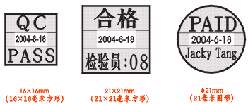日期印章耐用,耐油,制作簡便,圖文清晰,可反復使用。適用于工廠、倉庫、銀行財務(wù)系統(tǒng)。一般客戶用的大都是圓型的小印章,中間有日期,有中文及英文兩種,日期可調(diào),而且本產(chǎn)品20mm以內(nèi)直徑的自帶印臺及盒子,有五種顏色選擇。(尺寸選擇13mm-42mm)