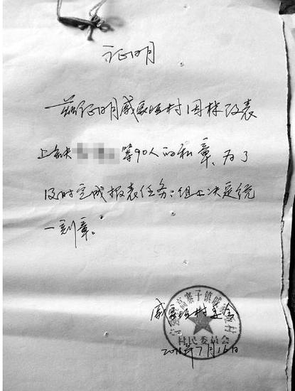8月24日,記者第一次來到該村一組。四家村民向記者出示了他們拿回來的印章。這四枚印章大小、款式統(tǒng)一,和村民自家印章明顯不同。同時村民還拿出了一份事發(fā)當天楊春平讓別人代筆的證明。村民李長江說:“12號我們發(fā)現章子被刻,14號楊春平就消失了,家里沒有一個人!8月28日,村民李長恩打電話告訴記者楊春平回家了。記者再次來到該村。楊春平是個殘疾人,一直乘坐輪椅。對于他事發(fā)后的神秘消失,楊春平解釋他去了趟西安。針對刻章事件,他解釋說:“組長李長友先后讓我刻章三次,第一次刻了86個,第二次刻了17個,第三次刻了4個,總共107個!比缓笏贸錾w有村委會公章的證明。只見該證明上寫著:“茲證明戚家埡村因林改表上缺×××等90人的私章,為了及時完成報表任務,組上決定統(tǒng)一刻章!薄暗谝淮谓o(我開具)了證明,第二次和第三次沒有”,楊春平說。