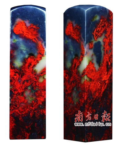 桂林東方舟雞血紅碧玉有限公司總經(jīng)理東方舟則介紹道:雞血玉有幾個特征,顏色豐富,以紅色為主,兼?zhèn)淞撕吞镉竦陌、翡翠的綠、壽山石的黃以及黑色和灰色。一方面可以說顏色雜,但另一層面講它的顏色很豐富。雞血玉以紅為上,它的紅色越鮮明越有收藏價值,最可貴的是帶有活性的鮮紅色。收藏家傾向于收藏“黑底飄紅”,一是顏色對比度很強,二是好取材雕刻。
