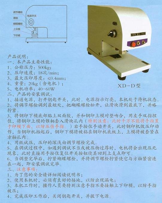 鋼印是常見印章,很多人畢業(yè)證書上都會見到此印章,這種 印章有上下兩個模,上方是凹模,下方是凸模,蓋出的印跡有凹凸感。(另有電動鋼印,見下圖是新型自動化小型現(xiàn)代辦公設(shè)備。它解決了傳統(tǒng)手動壓印,勞動強度大、壓印質(zhì)量差、效率低等缺點,具有外型美觀,壓印速度快,全自動操作等功能。特別適用于處理大批量文件的壓印,是國家機關(guān)、文教部門,各級各類發(fā)證部門等首選的辦公自動化設(shè)備。)